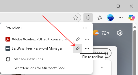 Estimated Reading Time: < 1 MinuteNote: These steps apply after you have installed the LastPass password manager extension in Edge.